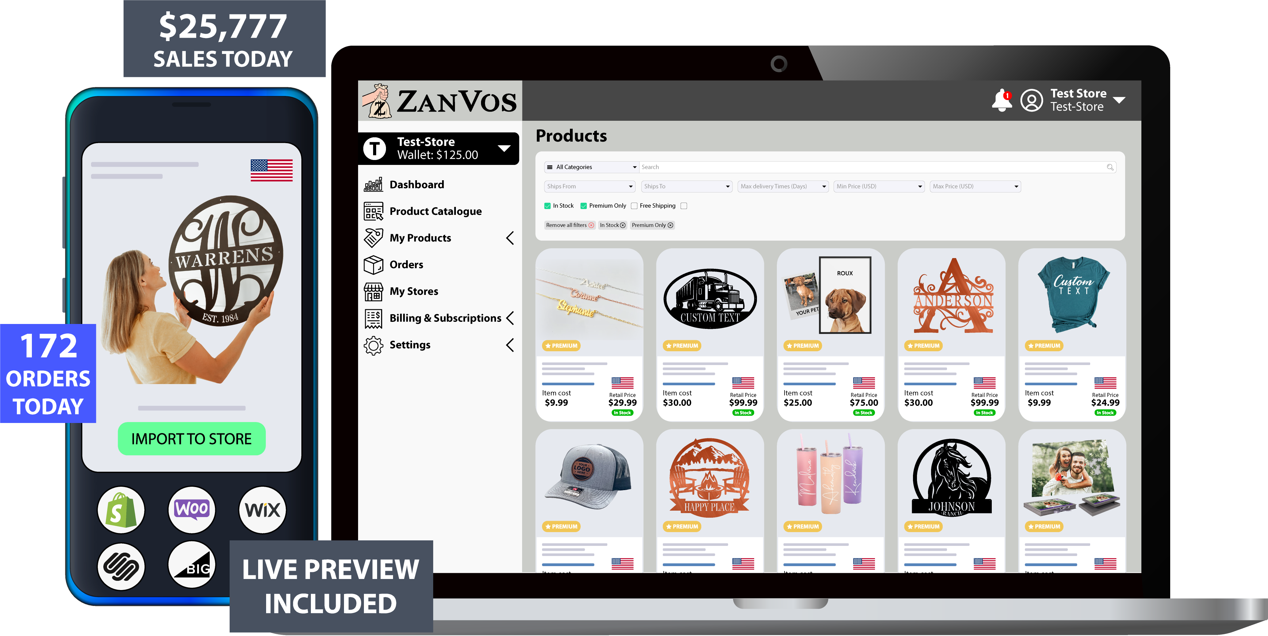 The ZanVos App allows you to choose the best customizable products on the market. You can import our customizable products and live previews with a click of a button.